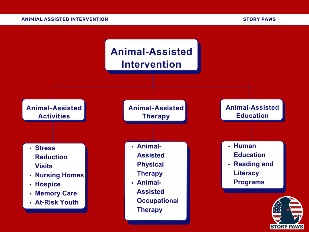 Story Paws brings the healing power of animals to people in a variety of environments- classrooms, nursing homes, physical rehabilitation centers, and many other locations. Our current featured pup, Raja, is a registered therapy dog who LOVES meeting new people. Therapy dogs provide Animal-Assisted Interventions, which include Animal-Assisted Therapy, Animal-Assisted Education, and Animal-Assisted Activity. Be sure to check out our research page to learn more!